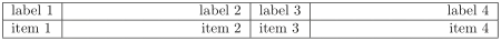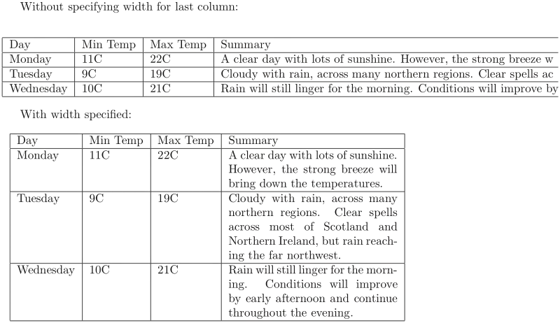 Here is a simple example. The following code creates two tables with the same code; the only difference is that the last column of the second one has a defined width of 5 centimeters, while in the first one we didn't specify any width. Compiling this code:
