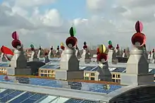• The buildings use roof-mounted wind cowls for ventilation with minimal heat loss. Vanes on the cowls angle them to the wind, allowing fresh air to be brought into homes. The outgoing air warms the incoming air through a built-in heat exchanger.[6]