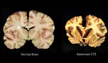 In 2002, Dr. Bennet Omalu was the first to identify football-related brain injury in NFL player Mike Webster’s brain tissue through tau protein buildup similar to that of Alzheimer’s sufferers. Webster's post-retirement life was unusual and erratic. He became aggressive and forgetful, and was for a time homeless and addicted to Ritalin. Within the ten years following Webster's death, the brains of five other retired NFL players who had died or committed suicide were found to have evidence of long term brain damage[19]. In 2014, 76 of 79 analyzed players brains showed the presence of CTE[20]. The neurodegenerative disease was named chronic traumatic encephalopathy (CTE), and had most commonly been found in the brains of boxers. Symptoms can include depression, paranoia, aggression, memory loss, poor eyesight, dementia, irritability, and reduced concentration[21].