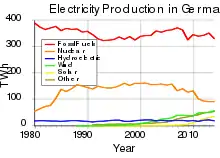 German for energy transition, Energiewende is a movement that began in the 1980s as an attempt to move away from nuclear energy and towards renewables.[6] According to the Heinrich Böll Foundation, the term Energiewende was first mentioned in the German Institute for Applied Ecology's 1980 study, which promoted energy efficiency for economic growth.[5] Local, community-driven efforts after the Chernobyl disaster led to the rise of solar power.