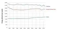 In 2012, Germany was the eighth largest consumer of energy in the world, and the largest in Europe.[2] Germany has consistently remained atop the world and Eurasian averages in energy consumption over the last 20 years (fig. 2). Germany still ranks fourth in coal and eighth in petroleum worldwide, despite decreased demand of those two resources by 35.7% and 15.6% respectively since 1991.[2] Germany depends on coal, nuclear, and petroleum for its energy needs.