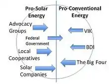 The German Solar Industry Association represents the interests of 800 companies.[15] According to the group’s communication director, David Wedepohl: “In the future, Germany’s electricity demand will be covered mostly with solar and wind power. That’s because people want the Energiewende, and they are increasingly taking things into their own hands."[14]