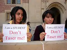 On September 17, 2007, Andrew William Meyer was tased by police at a University of Florida forum in which John Kerry was a guest speaker. Meyer asked an inappropriate question, then resisted police who were trying to escort him off the premises. His pleas and cries for help are either comical or chilling, depending on the viewer's reaction. His catch phrase "Don't tase me bro!" has become a part of pop culture. This incident was caught on tape and has more than 5.25 million views.