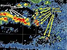 A visual comparison of storms and wind turbine returns on doppler radar system[13]
