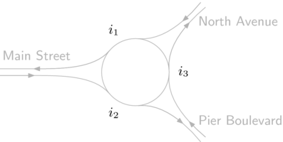 - Label the three between-road arcs in the circle with a variable. Using the (adapted) Current Law, for each of the three in-out intersections state an equation describing the traffic flow at that node.