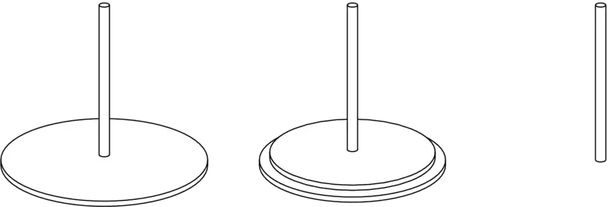 Now we can move the big disk over. Then, to finish, we repeat the process of moving the smaller disks, this time so that they end up on the third needle, on top of the big disk.