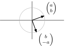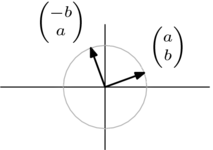 We can use this insight to delimit the geometric actions possible in distance-preserving maps. Because , any is mapped by to lie somewhere on the circle about the origin that has radius equal to the length of . In particular, and are mapped to the unit circle. What's more, once we fix the unit vector as mapped to the vector with components and then there are only two places where can be mapped if that image is to be perpendicular to the first vector: one where maintains its position a quarter circle clockwise from