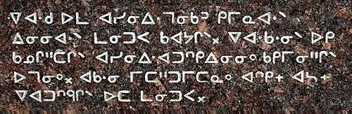 Swampy Cree (Nēhinawēwin) is a dialect of Cree, an Algonquian language spoken in Manitoba and Ontario. It is one of a number of Canadian languages which uses a writing system which is a type of the collection of related orthographies known as Canadian Aboriginal syllabics (or just syllabics). The following is an Swampy Cree inscription from Winnipeg, written in syllabics. Using the transcription of the text in the Latin alphabet, given below, determine what rules govern characters in Cree syllabics, and what type of script you think it should be considered as.
