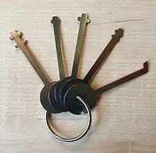 A traditional set of lockpicks. The two tools on the left are tension wrenches