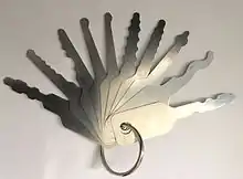 Picking warded locks is regarded as fairly easy as all you need to do is choose and insert a warded pick (see right hand image) and turn until the lock opens. If the lock does not open, choose another pick until it does.