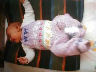 If you knit a flap, then do not make it too wide, as it will fold. You can increase and slope it, so it is not too wide at the neck. Finish with a rib border or seam, and remember buttonholes. On the back, you can either make a flap that is similar, except that it has shoulder straps, or shoulder straps may be fixed just by picking up stitches on the back seam. If you have buttonholes in the front and buttons on the shoulder straps, you can make the shoulder straps a little too long, so you have the possibility to move the buttons when the baby has grown. You can pull a string through the seam, or for bigger babies a rubber band.