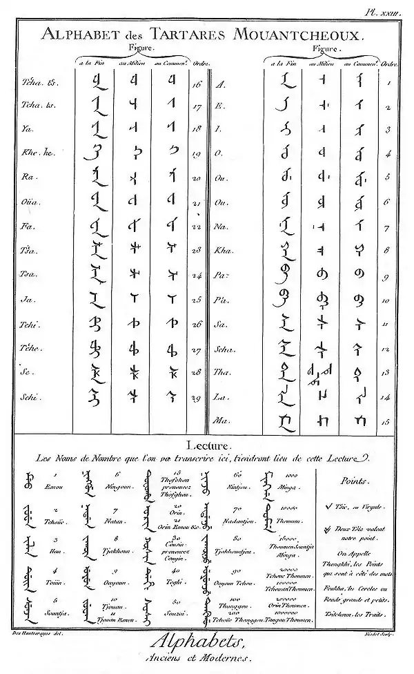 If we analyse the Manchu script as if it was an alphabet (as opposed to a syllabic script) then the Manchu script has 6 letters to represent the six Manchu vowels, and 18 letters to represent Manchu consonants. As with most other Semetic scripts, each letter of the Manchu script has an independent, an initial, medial and final form.
