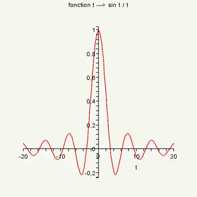 > plot(sin(t)/t,t=-20..20,title="function t ---> sin t / t");