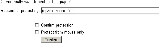 First of all visit the page in question and click the protect tab. You will be presented with one of two boxes, depending on the version of MediaWiki your wiki is running. Both methods are presented below. For the record, Wikicities is currently running MediaWiki 1.4 while Wikimedia projects are running 1.5.