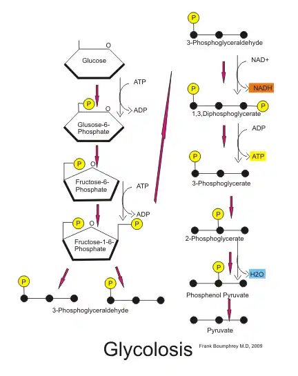 Energy is for the most part utilized by cells as ATP which is broken down into ADP with the release of energy. The main source of energy in the cell is glucose, although both fats and amino acids can produce energy by entering into the glycolysis pathway, as is illustrated below. The end product of the glycolysis pathway is pyruvate. In the presence of oxygen, pyruvate is taken into the mitochondria, and processed in the citric acid cycle (CAC), producing some ATP but also a lot of high-energy hydrogen bonds in the form of FADH and NADH. These bonds are then taken into the mitochondrial membrane space and are processed into ATP via the electron transport system. A feature of this process is the way that the various metabolic pathways occur in different parts of the cell. Glycolysis occurs in the cell cytoplasm; the citric acid cycle occurs in the inner mitochondrial space; and the High Energy Transport system occurs in the intermembraneous space of the mitochondria. A summary of the process is shown in the following flow diagram: