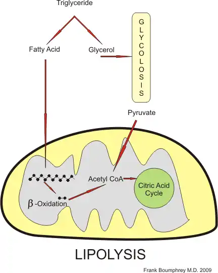 Fats are first broken down into glycerol and fatty acids. The glycerol molecule enters directly into the glycolysis pathway, and the fatty acid is taken into the mitochondria. There, by a complex process called beta-oxidation, it is broken down into two carbon atom units and is then converted to Acetyl coA
