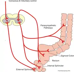 Although the myenteric defecation signal only weakly relaxes the Internal anal sphincter, the stronger signal comes from parasympathetic reflexes synapsing in the sacral cord. These can be inhibited centrally, and when time to defecate is convenient, the inhibition is released, and the external anal sphincter, under voluntary control is relaxed.