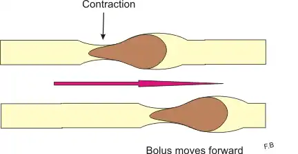 Peristaltic contractions move food and chyme down the lumen of the bowel. Circular muscles contract behind a bolus of food, the muscles in front of the bolus relax and this wave of contraction proceeds down the bowel propelling the bolus of food forward.