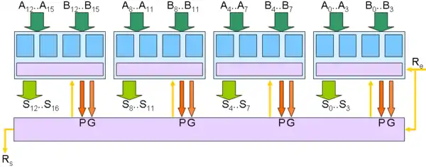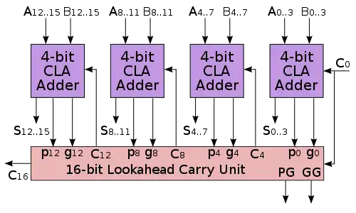 The power of carry-lookahead adders is that the bit-length of the adder can be expanded without increasing the propagation delay too much. By cascading lookahead modules, and passing "propagate" and "generate" signals to the next level of the lookahead module. For instance, once we have 4 adders combined into a simple lookahead module, we can use that to create a 16-bit and a 64-bit adder through cascading:
