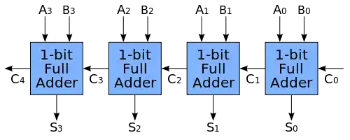 Numbers of more than 1 bit long require more then just a single full adder to manipulate using arithmetic and bitwise logic instructions[citation needed]. A simple way of operating on larger numbers is to cascade a number of full-adder blocks together into a ripple-carry adder, seen above. Ripple Carry adders are so called because the carry value "ripples" from one block to the next, down the entire chain of full adders. The output values of the higher-order bits are not correct, and the arithmetic is not complete, until the carry signal has completely propagated down the chain of full adders.