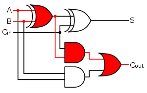 Full adder circuits are similar to the half-adder, except that they do account for a carry input and a carry output. Full adders can be treated as a 3-bit adder with a 2-bit result, or they can be treated as a single stage (a 3:2 compressor) in a larger adder.