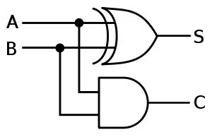 A half adder is a circuit that performs binary addition on two bits. A half adder does not explicitly account for a carry input signal.