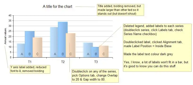 While this approach is understandable, the problem is that it results in charts lacking visual appeal. The best way to correct this is to see the effect of making some changes. Please note that there are many ways to do this, and these changes are not necessarily the best.