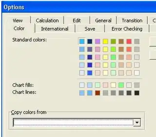 - Select Tools, Options, and then the Color tab. You'll see a dropdown labeled "Copy colors from". Click this and pick the workbook you want to copy from.
