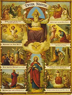 The image refers us to connect the Lord's Prayer (Christian main mantra) with visualizations and thereby strengthen the spiritual effect considerably. To have a powerful effect, we should speak or think the prayer how it fits us best. We should interpret the images so that they are helpful to us. We can formulate the sentences of the Lord's Prayer in our own words. This can help us to come better into contact with the energy of the prayer. The Pater Noster picture divides the Lord's Prayer in eight areas.