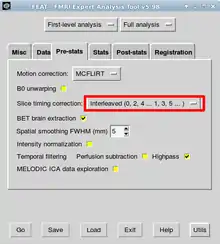In the FSL GUI select FEAT and then the pre-stats tab. There you can change Slice time correction: from None to the appropriate option, depending on how your slices where acquired. If slices were acquired from the bottom of the brain to the top select Regular up. If slices were acquired from the top of the brain to the bottom select Regular down. If the slices were acquired with interleaved order (0, 2, 4 ... 1, 3, 5 ...) then choose the Interleaved option. If slices were not acquired in regular order you will need to use a slice order file or a slice timings file. If a slice order file is to be used, create a text file with a single number on each line, where the first line states which slice was acquired first, the second line states which slice was acquired second, etc. The first slice is numbered 1 not 0. If a slice timings file is to be used, put one value (ie for each slice) on each line of a text file. The units are in TRs, with 0.5 corresponding to no shift. Therefore a sensible range of values will be between 0 and 1. [4]