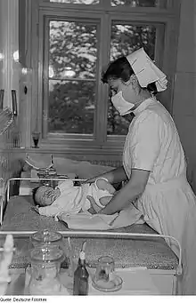 Nurse using reverse barrier to prevent contaminating infant with face mask