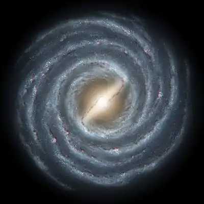 The Milky Way consists of a bar-shaped core region surrounded by a disk of gas, dust and stars forming four distinct arm structures spiralling outward in a logarithmic spiral shape. The mass distribution within the galaxy closely resembles the SBbc Hubble classification, which is a barred spiral galaxy with relatively loosely wound arms.