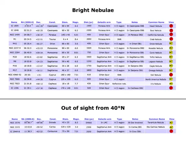 - Dist.(pc): approximate distance of the nebula, expressed in parsec. To obtain the distance in light-years, moltiply for 3.26.