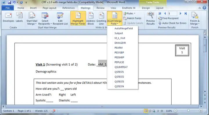 2. The Word merge also produces a marked-up CRF with code lists for data analysis