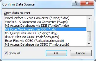 4. When you are prompted for the data source, click 'Show All', and select 'MS Excel Worksheets via DDE (*.xls)'. DDE prevents accuracy issues with floating point numbers, where numbers such as 1.99 are displayed as 1.989999999 on merge.