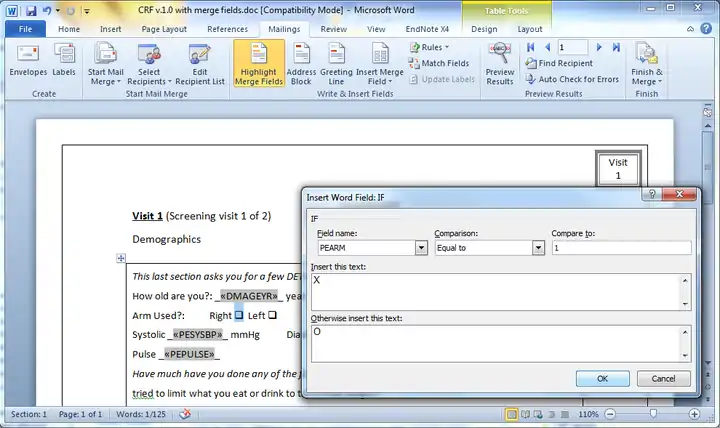 If multiple Openclinica CRFs are used to model a single paper CRFs, then an additiona spreadsheet (with up to 256 data points) can be used to merge the merge sheets prior to the Word merge. If more than 256 points are needed, multiple Word merges must be done.