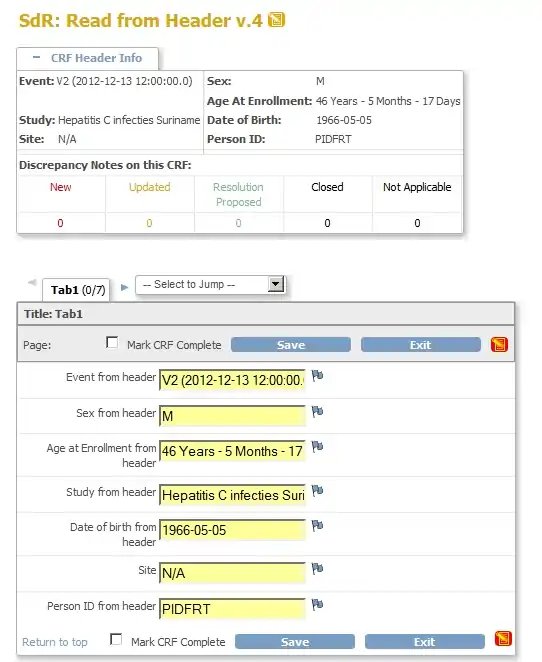 On rare occasions you may want to copy some of the contents of the CRF header into your CRF. For example the Site name, or Age at Enrollment. This information is all in the header of the CRF, but most of the time it is not visible, because the header is collapsed. When you click on the link CRF Header Info, a table is displayed with information.