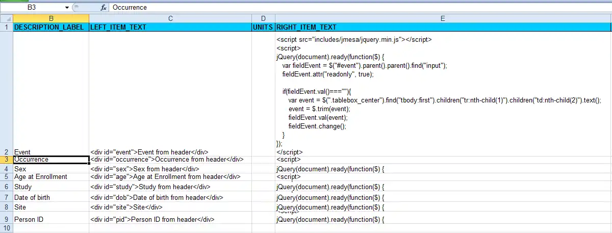 The way to get this info in your CRF is by using JavaScript. Let's look at the script for getting the Event-name. First you identify the CRF-item that will hold the Event name from the header, in our case we call the item "Event". For the JavaScript to recognise this input as the one we want to work with, we add a div tag to the LEFT_ITEM_TEXT with <div id="event">Event from header</div>