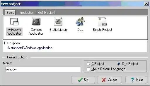 First open up Dev – C++. When it opens up, click on the top menu bar File, New, Project. Make sure the Basic tab is selected and click on Windows Application. Then give it a name and press OK. Then in the next dialog, choose a location on your computer to save and then press Save: