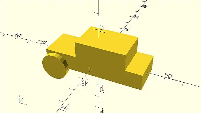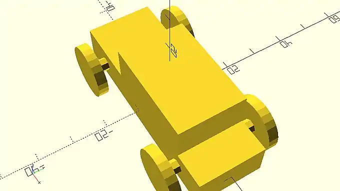 The model that you just created looks like the body of a car that has bad aerodynamics. That’s ok. You will be making the car look a lot more interesting and aerodynamic in the following chapters. For now, you are going to use the cylinder primitive and the rotate transformation to add wheels and axles to your car. You can create a wheel by adding a third statement that consists of the cylinder command. You will need to define two input parameters, h and r. The first one will be the height of the cylinder while the second one will be its radius.