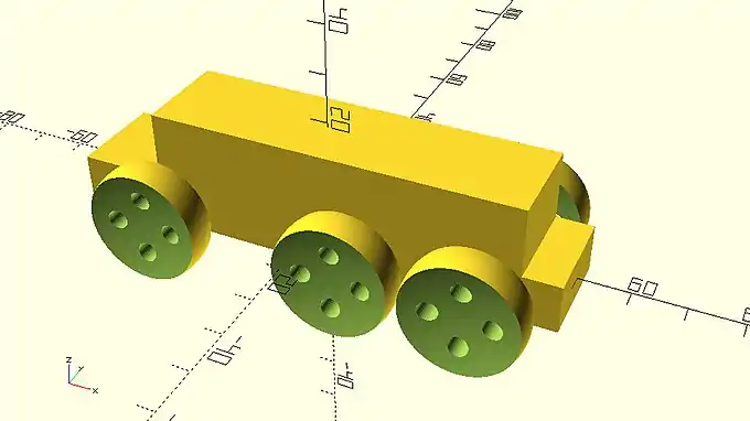 The second thing you should notice is that OpenSCAD has not created any wheel. This is because you have just defined the wheel module but have not used it yet. In order to create a wheel you need to add a statement that creates a wheel, similar to how you would add a statement to create any primitive object (cube, sphere etc.).