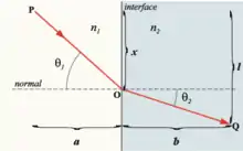 The derivation of Law of Reflection using Fermat's principle is straightforward. The Law of Reflection can be derived using elementary calculus and trigonometry. The generalization of the Law of Reflection is Snell's law, which is derived below using the same principle.
