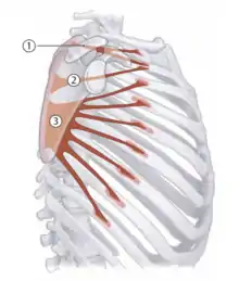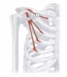 | Pectoralis minor | Ribs 3-5 | Coracoid process | Scapular protraction; respiration | Medial and lateral pectoral nerves (C6-T1) | ![]() 2 - Pectoralis minor |