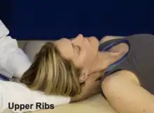 | Exhalation dysfunction key rib 2 (posterior scalene) | Patient is supine. Ask patient to place the dorsum of their dysfunction-side hand on their forehead, and then rotate their head away from the side of the key rib. Contact the key rib as close to the costotransverse junction as possible with one hand, and stabilize the patient’s head/hand with the other hand. Ask the patient to perform a forced maximal inhalation and simultaneously try to lift their head off the table. Resist their head motion, and during the inhalation phase apply a caudad force on the key rib at the costotransverse junction. | ![]() Rib 2 exhalation dysfunction |