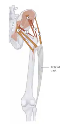| Piriformis | Anterior surface of the sacrum | Greater trochanter of the femur | Hip: external rotation, abduction, and extension | Sacral plexus (L5-S2) | ![]() 5 - Piriformis |