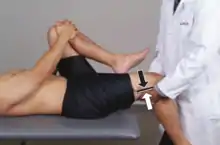 | Internal rotation | Flex the hip and flex the knee while internally rotating the hip to its barrier | ![]() Spencer's technique of the hip - internal rotation |