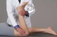 C. The knee is flexed and the dorsum of the foot is placed on the physician's thigh while the physician applies a compressive force on the calcaneus to produce marked flexion