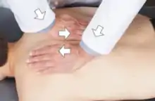 | The "alternating catwalk" variation of unilateral prone pressure: The patient is prone with the physician on the opposite side of the region to be treated. The physician places their hands on the medial aspect of the thoracic paraspinal muscles above the transverse processes and adds a downward lateral force with the caudad hand which is held for 3-5 seconds. As the force is released with the caudad hand, the cephalad hand begins to add a downward lateral force. The process is repeated for 30 seconds. Reassessment of the thoracic spine can be done by assessing active and passive ranges of motion compared to those prior to performing the technique and also by reassessing tissue texture changes/TART. | |