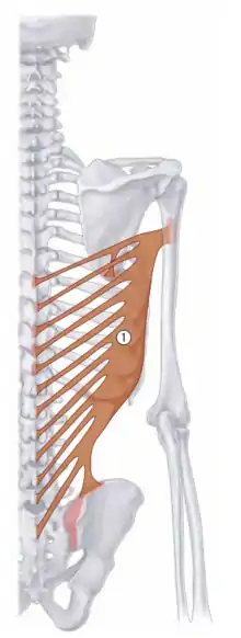 | Latissimus dorsi | T7-T12 spinous processes; iliac crest; ribs 9-12 | Lesser tuberosity of the humerus | Internal rotation, adduction, retroversion; respiration (“cough” muscle) | Thoracodorsal nerve (C6-C8) | ![]() 1 - latissimus dorsi |