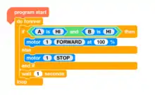 The AND activity Using the A & B inputs write a program to light the motor LED only when A AND B is hi.